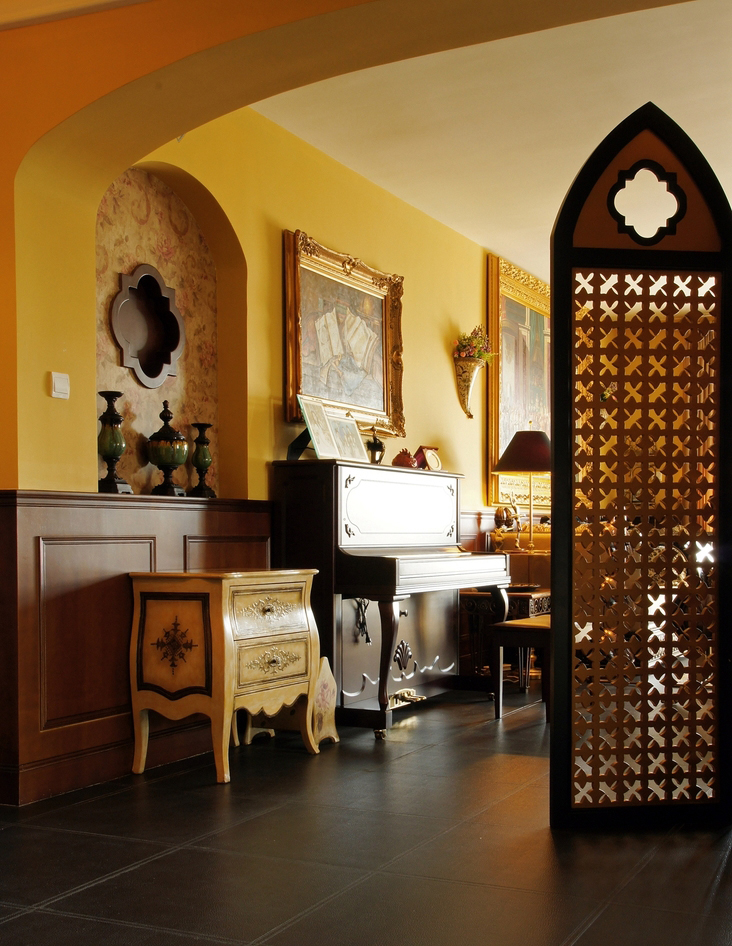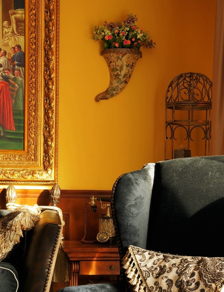*皇家貴族* 語出業(yè)主Angel:“御金香,這個好,有氣派,有皇家貴族的味道...” 篩選作品名字時,我拿出幾個備選名,與Angel逐個淘汰后,鎖定《御金香》。 *風格大跳躍* 與之前的作品《珊瑚島奇遇記》不同,這次的設計風格跳躍很大。Angel家適合美式風格,可能跟Angel之前長期生活在美國有關系。設計過程中我還在想,可否“植入”中式古典元素,做成“形散神不散”的后現(xiàn)代混搭風格。自從在“加洲地帶”選定床和衣柜款式后,我立馬打消了這個念頭。最后只是象征性地在茶幾旁邊植入兩張中西合壁的陶瓷凳。 *暴發(fā)戶* 語出Angel的先生:“導火牛。不會是那個顏色吧?太暴發(fā)戶了,我不要暴發(fā)戶的感覺,很土。” 當客廳墻裙還是半成品時,Angel的先生以為是成品油漆的顏色,指著墻裙納悶地說道。 我馬上重復在工地經常說的一句口頭禪:“是半成品。還沒上好顏色。”整個設計完成后會凸顯歐洲貴族氣。 *拿破侖他老媽呢?* 沙發(fā)背后的巨幅掛畫,由于畫師的“偷工減料”,拿破侖加冕圖上的另一關鍵人物--拿破侖的老媽不在畫中。 我們又跑回油畫村,重新?lián)Q了一幅人物更飽滿的拿破侖加冕油畫,同時將18厘米的畫框加大成22厘米。氣勢立竿見影。 *波斯王子* 波斯王子、異域風情、蝴蝶夫人、神秘尼羅河... 無論以怎樣的角度審視,客廳沙發(fā)傳達出每個細節(jié)的氣質都耐人尋味。 在不少家具賣場看過一些山寨版。都沒有這樣的神韻。 *夏威夷瀑布* 客房的藍色條紋布、青果色墻漆、米白吊扇..... 太陽照在“鋪滿鮮花”的床單上,夏威夷的夢停靠在傾瀉的窗紗上... *韓版青春美少女* 語出Angel的QQ簽名款,這是她給女兒房的定義。女孩房的風格定位與客廳、書房的絕然不同。 根據(jù)年齡的劃分,每個家庭成員都可以匹配屬于自己的個性空間。仍是“以人為本”的設計核心理念。