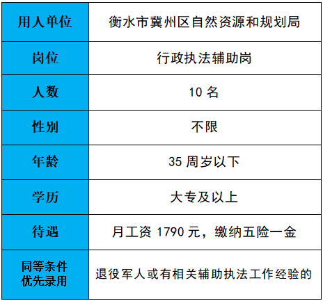衡水天翔勞務派遣有限公司接受衡水市冀州區自然資源和規劃局的委托,結合實際用人需求,面向社會公開招聘10名行政執法輔助人員。具體招聘事宜如下: